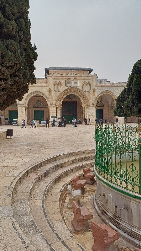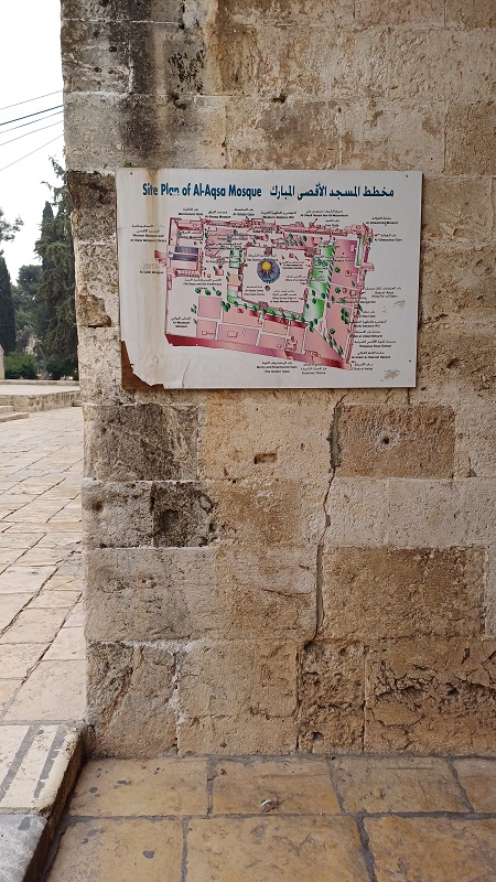 Anschließend machte ich mich auf den Weg zum Dome of the Rock, der auf dem Plateau über der Klagemauer liegt. Ich und die anderen Besucher mussten eine Zeit lang warten, bis eine kleine Pforte geöffnet wurde. Vorher natürlich Metalldetektor. Der Dome of the Rock hat ein goldenes Dach. Von hier ist Mohammed gelegentlich auf seinem mythischen Ross namens Bouraq, so eine Art muslimischer Pegasus, zum Siebten Himmel hinaufgeritten. Dort traf er nacheinander Adam, Jesus, Johannes den Täufer, Enoch, Aaron, Moses