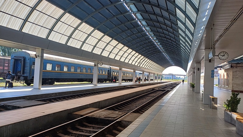 Mitten in der Nacht wurden wir unsanft geweckt: Grenzkontrolle in Ungheni! Aussteigen leider verboten. Ein mürrischer Beamter schaute sich unsere Pässe an und ging dann weiter. Kurze Zeit später kam ein Eisenbahner mit einem Tablett, auf dem ein großer Metallstab mit einem Haken dran lag. Er schob den Teppich beiseite und darunter wurde eine runde Metallplatte sichtbar. Er hob sie ab, führte den Metallstab in die Öffnung und zog einen langen, stählernen Viertelstab heraus. Den legte er auf das Tablett und zog einen weiteren heraus, bis alle vier darauf lagen. Dann schob er das Tablett unter mein Bett und verließ das Abteil. Als wir aus dem Fenster schauten, sahen wir, dass der Waggon sich langsam anhob. Dann fiel bei mir der Groschen: Wechsel auf die russische Breitspur! Unser Abteil lag offenbar genau über dem Fahrgestell, daher der Besuch des Eisenbahners. Unter uns rumpelte und schepperte es und wir hörten Hammerschläge. Dann ging es langsam wieder hinunter. Nach einiger Zeit erschien der Eisenbahner erneut und schob die Viertelstäbe zurück in ihre Halterung. Deckel drauf, Teppich drüber – und fertig war’s. Low Tech at its best – aber funktioniert!