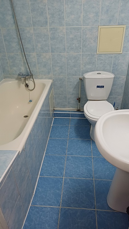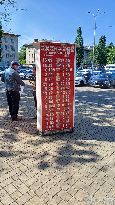 Das Bad war blau gekachelt, 60er-Jahre-Stil. Fair enough! Frühstück war inbegriffen, d. h. man bekam an einem Kiosk im Hotel eine Tasse Kaffee und einen Donut. Na ja … Zu meiner Verwunderung schien ich der einzige Gast in diesem Riesenbau zu sein. Später bemerkte ich, warum. Die Heizung funktionierte nicht, desgleichen Warmwasser im Bad. Nun konnte ich ja schlecht erwarten, dass man wegen eines Gastes die Zentralheizung anwirft. Man gab mir einen Heizlüfter, der jedoch nach 3 Minuten seinen Geist aufgab. Dann brauchte der erst mal eine Stunde Erholung. Nach ca. einer Viertelstunde kam sogar lauwarmes Wasser aus der Leitung. Aber für eine Nacht war es o.k. Dann ging ich zum Busbahnhof, wo ich endlich Geld wechseln konnte: 18 moldawische Lei = 1 Euro. Ich kaufte mir für den nächsten Tag ein Busticket nach Tiraspol (57 Lei).