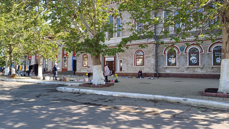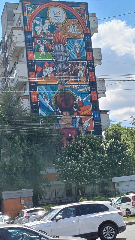 Auf der russischen Breitspur ging es weiter nach Chisinau, kurz darauf dämmerte es schon. Pünktlich um 7:44 erreichten wir Chisinau. Mein Reisegefährte hatte nur wenig Gepäck und verabschiedete sich schnell, während ich meinen schweren Koffer mit Mühe aus dem Zug wuchtete. Der Bahnhof von Chisinau (russisch Kischinjew) ist so modern wie menschenleer und dient offenbar auch als Ausstellungsraum für moderne Kunst à la Moldawien. Ich irrte ein wenig umher und entdeckte schließlich einen Money Changer. Leider geschlossen! Also ging ich nach draußen, wo ein paar Taxis warteten. Der Fahrer freute sich, dass ich ihn mit Euro bezahlte. Vor dem Bahnhof gab es eine Art Open-Air-Markt, dort standen und saßen viele Leute, die ihr spärliches Second-Hand-Warenangebot feilboten. Irgendwie deprimierend …