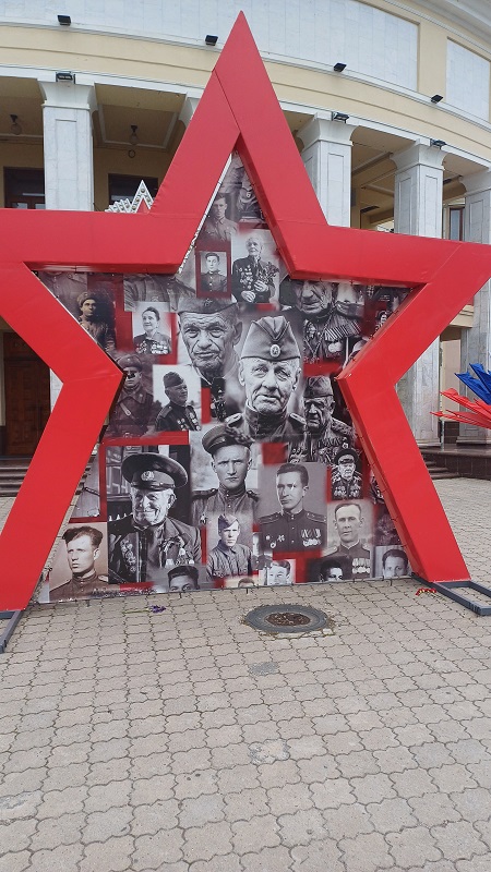einen Cappuccino und ein Stück Kuchen gegönnt hatte, ging ich die Straße der Oktoberrevolution Richtung Osten hinunter bis zum Theaterplatz. Ich war begeistert! Genau so hatte ich es mir vorgestellt! Überall Fahnen, riesige Fotowände mit Bildern offenbar verdienter Genossen, viele Gebäude im Zuckerbäckerstil (Dom Sowjetow besonders schön.) Über der Straße hingen Flaggen. Besonders viel war allerdings nicht los an diesem späten Nachmittag; ich begegnete nur wenigen Menschen. Ich lasse die Fotos für sich sprechen.